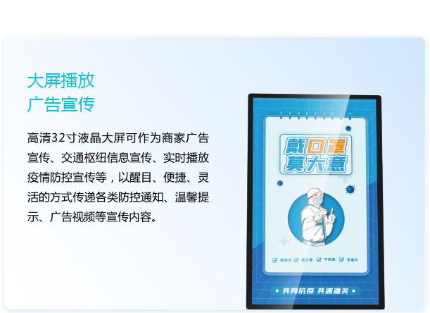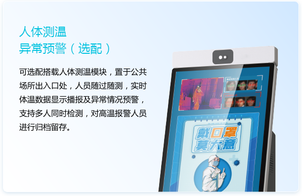 32寸主屏搭載可定制化模塊,提供迎賓接待、業務咨詢、體溫監測等特色服務的智能大屏機器人。可實現接待講解、引導跟隨、宣傳巡邏等功能,還可提供人臉識別、二維碼掃描、身份證讀取、叫號、打印等特色服務。