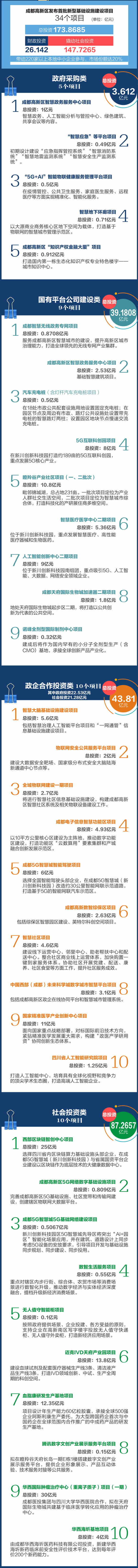 首批新基建項目總投資近180億元,其中,政府采購類項目5個、國有平臺公司建設類項目9個、政企合作投資類項目10個、社會投資類項目10個。項目中,成都5G智慧城智能駕駛項目、人工智能創新中心、車聯網智慧園等將落地成都G新區新川創新科技園。
