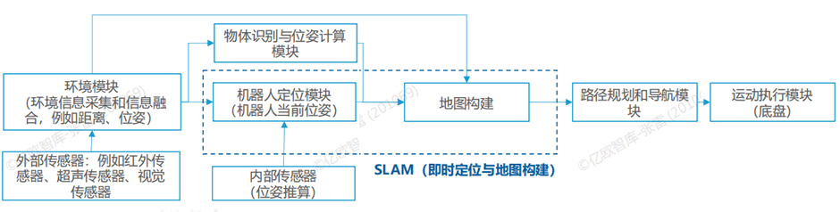 環境感知模塊的基礎硬件是各類不同的傳感器,他們充當了機器人的五官,收集不同的測量信息;SLAM算法(Simultaneous Localization and Mapping)用于融合收集的信息數據,以確定機器人在未知環境中的位置,并構建一張環境地圖,通過SLAM技術機器人可以在未知環境中進行自主探索和導航。