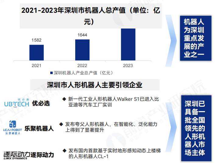 深圳市機器人產業發展良好,且擁有優必選、逐際動力、樂聚機器人等一批本體企業,發布了優必選Walker X、樂聚夸父、逐際動力CL-1等人形機器人產品,已具有人形機器人產業先發優勢。