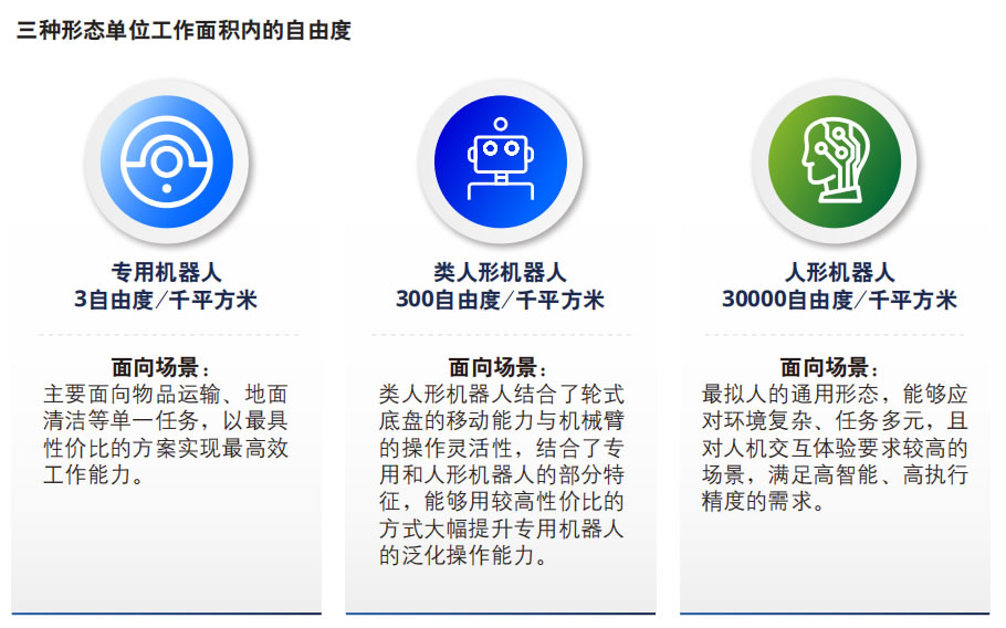 基于 “單位工作面積自由度”這一指標,可以更好地理解專用、類人形、人形三種形態機器人各自 的優勢和適用場景,以及如何根據特定的應用需求選擇合適的機器人形態,從而進一步推動生態的 構建: