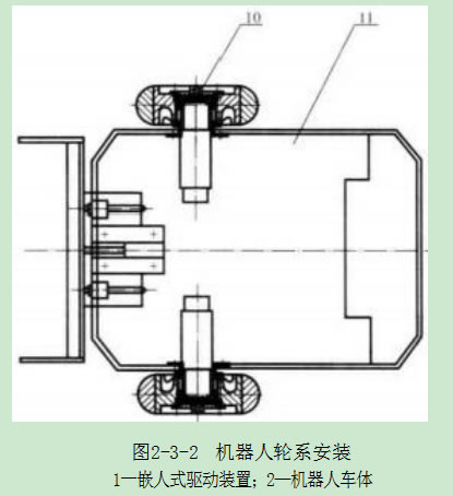 在該裝置中選用帶調(diào)速功能的直流電機(jī)作為動力,電機(jī)轉(zhuǎn)動時(shí)由電機(jī)軸直接 帶動,電機(jī)驅(qū)動法蘭盤與車輪緊固連接,繼而驅(qū)動車輪,實(shí)現(xiàn)直接驅(qū)動,車輪與電機(jī) 之間同步旋轉(zhuǎn),無任何變速環(huán)節(jié)和嚙合環(huán)節(jié),避免了累計(jì)回轉(zhuǎn)誤差和可能的打滑。 機(jī)器人車體上安裝左右兩個(gè)驅(qū)動裝置,通過對電機(jī)轉(zhuǎn)速的調(diào)節(jié)來控制車輪轉(zhuǎn)速和 回轉(zhuǎn)方向的變化,使機(jī)器人實(shí)現(xiàn)雙輪差動運(yùn)動,走直線、圓弧甚至更復(fù)雜的運(yùn)動。 橡膠車輪與電機(jī)安裝套間采用一對推力球軸承作為回轉(zhuǎn)副,軸承與電機(jī)安裝套。 外圈與橡膠車輪均為緊配合,兩軸承間以止推環(huán)和擋圈保持間距,軸承與電機(jī)安裝 套間通過軸承止推法蘭盤和電機(jī)安裝套的凸臺限位,保證整體機(jī)構(gòu)的穩(wěn)定和配合的緊密。整套裝置中,電機(jī)安裝套、電機(jī)驅(qū)動法蘭盤、軸承止推法蘭盤以及相應(yīng)連 接件推力球軸承、止推環(huán)、擋圈全部嵌入橡膠車輪中,配合緊密,同時(shí)起到車輪軸的 作用. 由于該結(jié)構(gòu)短而粗,所以剛度強(qiáng)度相當(dāng)大,能夠承受很強(qiáng)的沖擊。并且選用 的驅(qū)動電機(jī)嵌入電機(jī)安裝套,機(jī)器人對抗時(shí)車輪承受的沖擊由與車輪緊密配合的 電機(jī)安裝套等部件直接承受,避免了電機(jī)直接承受沖擊,起到緩沖作用。以上共同 構(gòu)成雙重嵌入式結(jié)構(gòu),結(jié)構(gòu)精簡、體積小,穩(wěn)定性高和緊密度高。嵌入式直接驅(qū)動 裝置如圖2-3-1所示,機(jī)器人輪系安裝如圖2-3-2所示。