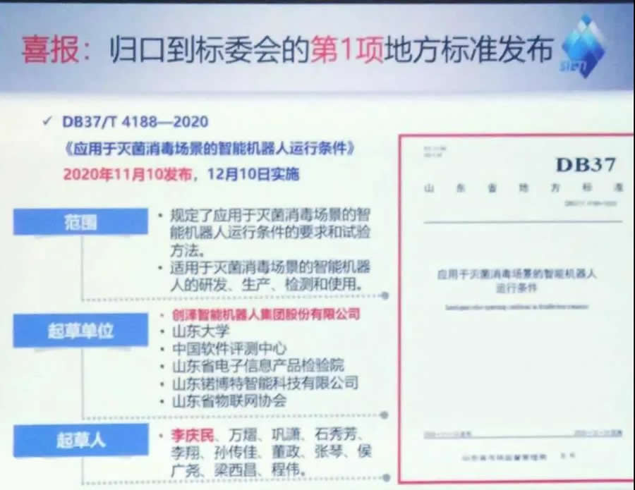 2020年11月10日,由創澤集團牽頭起草的全國《應用于滅菌消毒場景的智能機器人運行條件》標準正式發布。該標準經過廣泛征求衛健委、醫院等單位意見,確保標準的實用性。審查會專家一致認為,該標準合理、準確、可實施性強,對智能滅菌消毒機器人的研發、生產、應用具有指導作用。