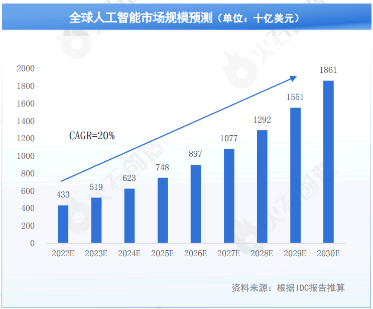 據(jù)IDC估算,2022年Al市場(chǎng)規(guī)模達(dá)到4328億美元,按同比增長(zhǎng)近20%推算,2030年人工智能市場(chǎng)規(guī)模將超過(guò)1.8萬(wàn)億美元。