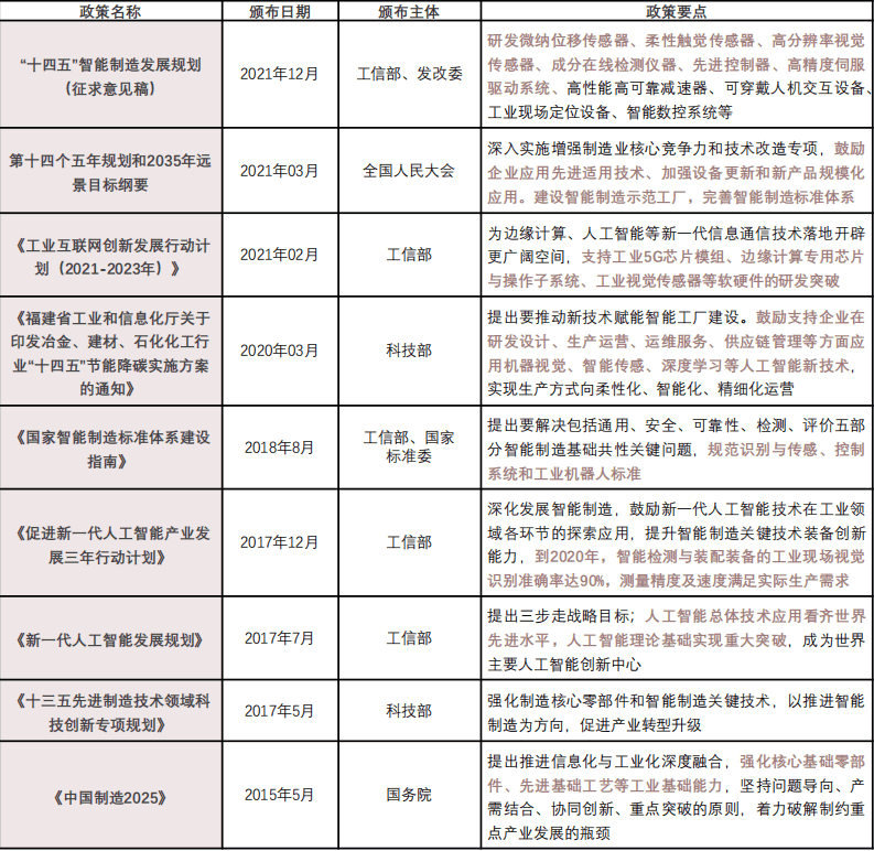 中國政府部門如國家信息與工業化部與相關產業聯盟較重視機器視覺產業的發展,先后出臺多項政策, 從提升產業鏈競爭力、加強先進適用技術研發以及發展機器視覺底層技術等方向促進中國機器視覺產 業的發展,同時機器視覺技術也被納入“十四五”智能制造規劃中的關鍵產業。
