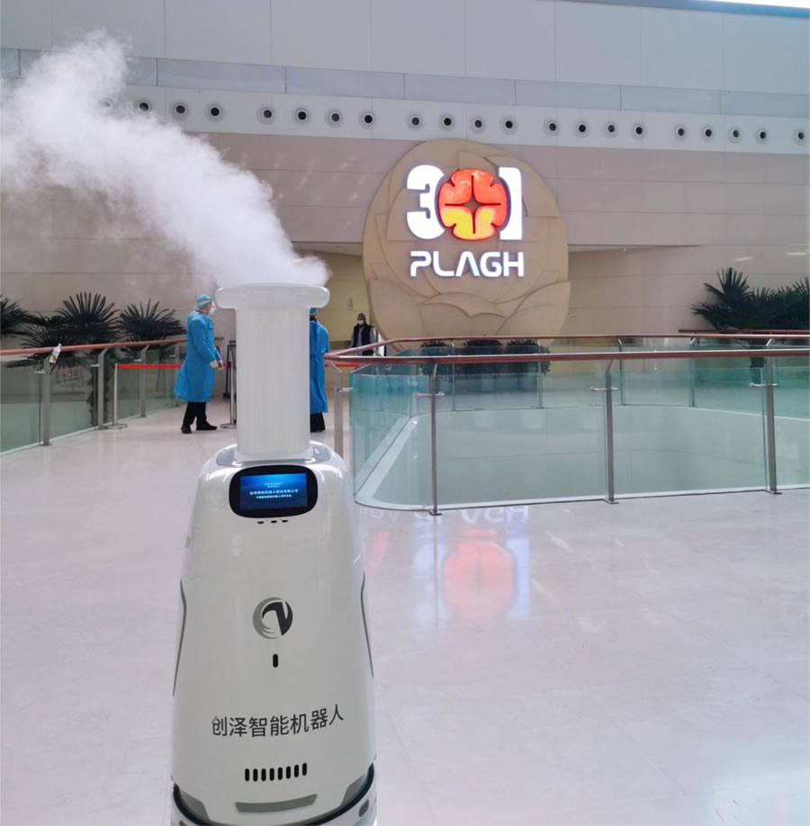 在中國人民解放軍總醫院D一醫學中心的門診大廳里,創澤智能消毒機器人頭D噴霧在醫院門診大廳走來走去進行全域消毒殺菌,實現消毒效果量化管理