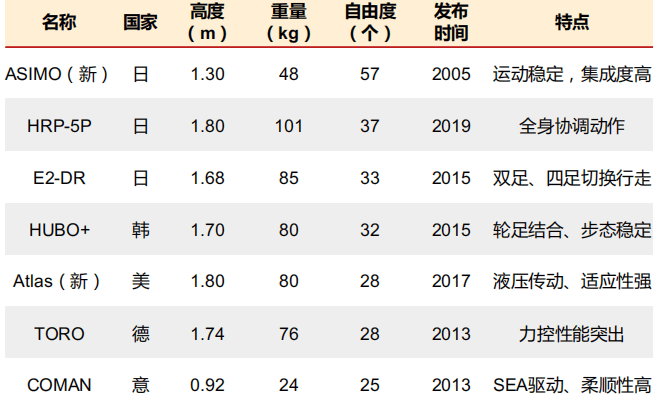群雄并起,逐鹿人形機(jī)器人。日韓在人形機(jī)器人L域布局早,研究表現(xiàn)活躍;美國在人形機(jī)器人L域后來居上。波士頓動力研發(fā)的代表產(chǎn)品Atlas身G1.8m,體重80kg,具有28個關(guān)節(jié),可完成原地起跳轉(zhuǎn)身一周等流暢、G難度的“跑酷”動作,但主