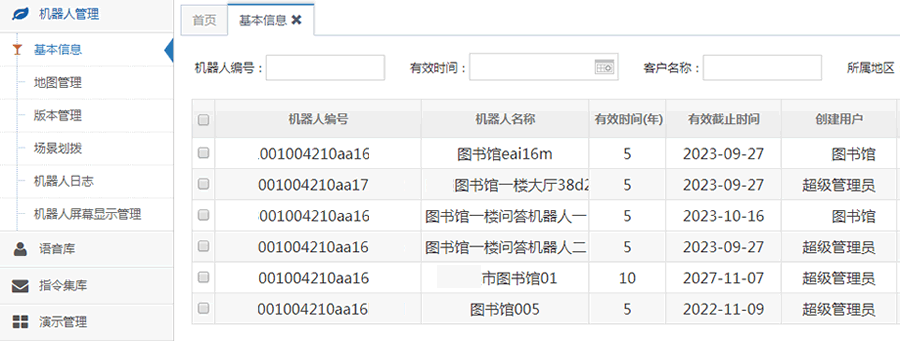 迎賓機器人管理的功能是對用戶使用的機器人信息進行管理,包括機器人基本屬性的配置,以及相關信息的常規操作,增刪改查等功能。