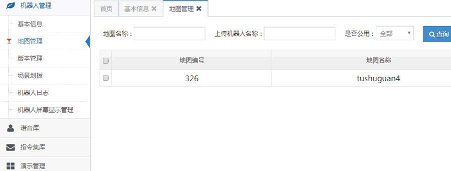 地圖管理模塊是對機器人地圖庫及對應地圖和記錄點的查看,包括地圖名稱,對應的機器人名稱和更新時間等內容。