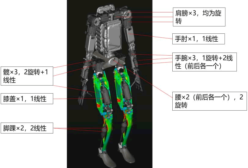 身體擁有 28個執行器,14個旋轉執行器+14 個線性執行器。分布如下:1)左臂+右臂: 7+7,其中肩部 3(×2)個旋轉執行器,肘部 1(×2)個直線執行器,手腕 1(×2)個旋 轉執行器+2(×2)個直線執行器;2)左腿+右腿:6+6,其中髖部 2(×2)個旋轉執行器 +1(×2)個線性執行器,膝蓋 1(×2)個線性執行器,腳踝 2(×2)個線性執行器;3) 腰部:2 個旋轉執行器。